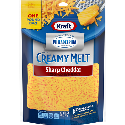 Enjoy Kraft Sharp Cheddar with a Touch of Philadelphia Shredded Natural Cheese! For your convenience, this delicious cheese has been pre-shredded so that it’s ready to be added to your favorite dish, and this resealable 16oz pouch ensures that your cheese will be fresh every time. Always made from fresh milk, Kraft shredded natural cheese is perfect for your family’s favorite pasta, casseroles, and more. You can even eat it as is as a satisfying snack! For over 100 years, Kraft has been making the cheese your family loves. So, no matter how you like it, we’ve got a cheese for you.