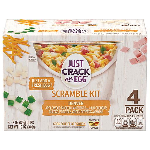 A scramble to add some spring to your step? Get outta here! Just Crack an Egg Scramble Breakfast Bowl Kits have everything you want in a morning starter. Ready in less than two minutes, our Just Crack an Egg Denver Scramble Breakfast Bowl Kit is made with applewood smoked ham, mild cheddar cheese, diced Ore-Ida potatoes, green peppers and onions. Simply add a fresh egg, stir the ingredients and microwave for a quick and easy bowl at home or on the go. Try preparing yours with two eggs for a heartier option. Our scrambled egg cups can also be made with egg whites. The Denver scramble breakfast bowl kit is a good source of protein to start the day off right. Keep the breakfast bowl kits refrigerated until you’re ready to prepare. The box contains four breakfast bowl kits.