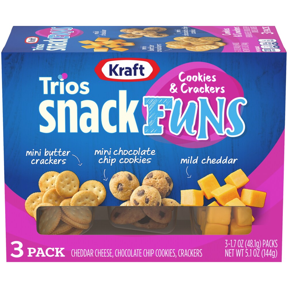 Putting the FUN in snacktime! DELICIOUS mini chocolate chip cookies. SMOOTH mild cheddar. CRUNCHY mini butter crackers. Inside each colorful box Kraft Trios SnackFUNS is a PERFECT snack mix inspired by some of your family's FAVORITE treats!