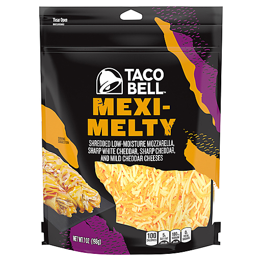 Shredded low-moisture mozzarella sharp white cheddar, sharp cheddar, and mild cheddar cheeses. 100 calories; 5 g sat fat (24% DV); 180 mg sodium (8% DV); 0 g total sugars. Kraftheinzcompany.com. Smartlabel. Kraftheinzcompany.com; 1-800-634-1984, have package available. Reclosable. Zip pak. Taco Bell Mexi-Melty Shredded Cheese mix takes your Mexican-inspired recipes to the next level with its delicious mixture of real Mexican style cheese. This quick melting cheese blend gives your favorite dishes signature Taco Bell flavor. This bag of cheese has a delectable taste that will elevate all your tacos and favorite Mexican meals. Delicious shredded mozzarella and cheddar cheeses combine for a mouth-watering taste you're sure to love. This Mexican shredded cheese blend is a great choice that adds a creamy smooth flavor to nachos or other inspired cultural specialties. Keep this 7 ounce easy-tear, resealable bag stored in the fridge. Make it Taco Bell tonight.
