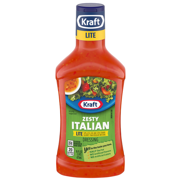 Kraft Zesty Italian Lite Dressing offers the taste you're craving with about one-third of the calories of regular dressing. Our light dressing has 50% less fat than regular Italian dressing, so you can prepare a tasty meal without guilt. Made with no artificial flavors or colors, this dressing has 1 gram of total fat and 25 calories per serving. Enjoy a dressing made with delicious ingredients, such as vinegar, dried garlic, dried red bell peppers and dried onions. Each bottle of lite dressing has authentic flavor. Use this dressing to make Italian pasta salad, to top your favorite lettuce salad, or as a chicken marinade. This 16 fluid ounce bottle design lets you easily squeeze the dressing over your food, and the pop-open top provides easy access.