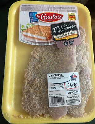 Escalopes De Dinde Marinées À La Milanaise. Ingrédients (À La Mise En Œuvre) : Escalope De Dinde Originefrance : 88%, Khapelufe De Blé : 8% (Farine De Blé, Levure, Sel), Eau-, Sel, Extraits D'Épices Ac(Dlfiants Acétate De Sodium, Lactate Dg Çalclum. Conditionné Sous Atmosphère Protectflce, a Savourer Cuit À Cœur. a Conserver Entre Occ Et +40Q a Consomme