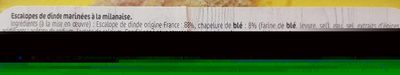 Escalopes De Dinde Marinées À La Milanaise. Ingrédients (À La Mise En Œuvre) : Escalope De Dinde Origine France : 88%, Chapelure De Blé : 8% (Farine De Blé, Levure, Sel), Eau, Sel, Extraits D'Épices, Acidifiants Acétate De Sodium, Lactate De Calcium. Conditionné Sous Atmosphèce Protectrice. a Savourer Cuit. a Conserver Entre 0 Et +4 Degrés Celcius.