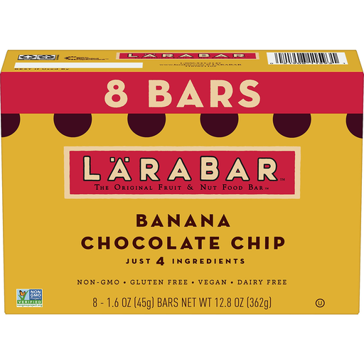 Dates. Almonds. Bananas. Chocolate chips. Gluten free. Vegan. Dairy free. Good source of fiber (Contains 8 g of fat per serving). Non GMO Project verified. nongmoproject.org. Non-GMO. The original fruit & nut bar. Just 4 ingredients. Simple. At Larabar we believe in keeping it real. That's why our products are made from real food. Power yourself forward with a bar that is as authentic and as real as the life you're living. Plant based. No artificial sweeteners. www.larabar.com. how2recycle.info.