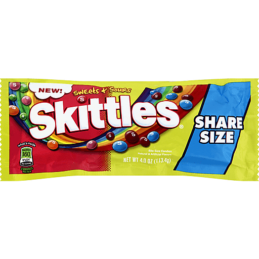 Package includes 4 ounce share size pack of Skittles Sweets and Sours. Bite-size, colorful chewy candies. Sweets & Sours include sour cherry, sour blue raspberry, sour watermelon, sweet orange and sweet strawberry flavors. Perfect for parties, game-time snacks, or even as a topping for your favorite dessert. Use these bright, bold Skittles candies in arts-and-crafts projects or as decorations.
