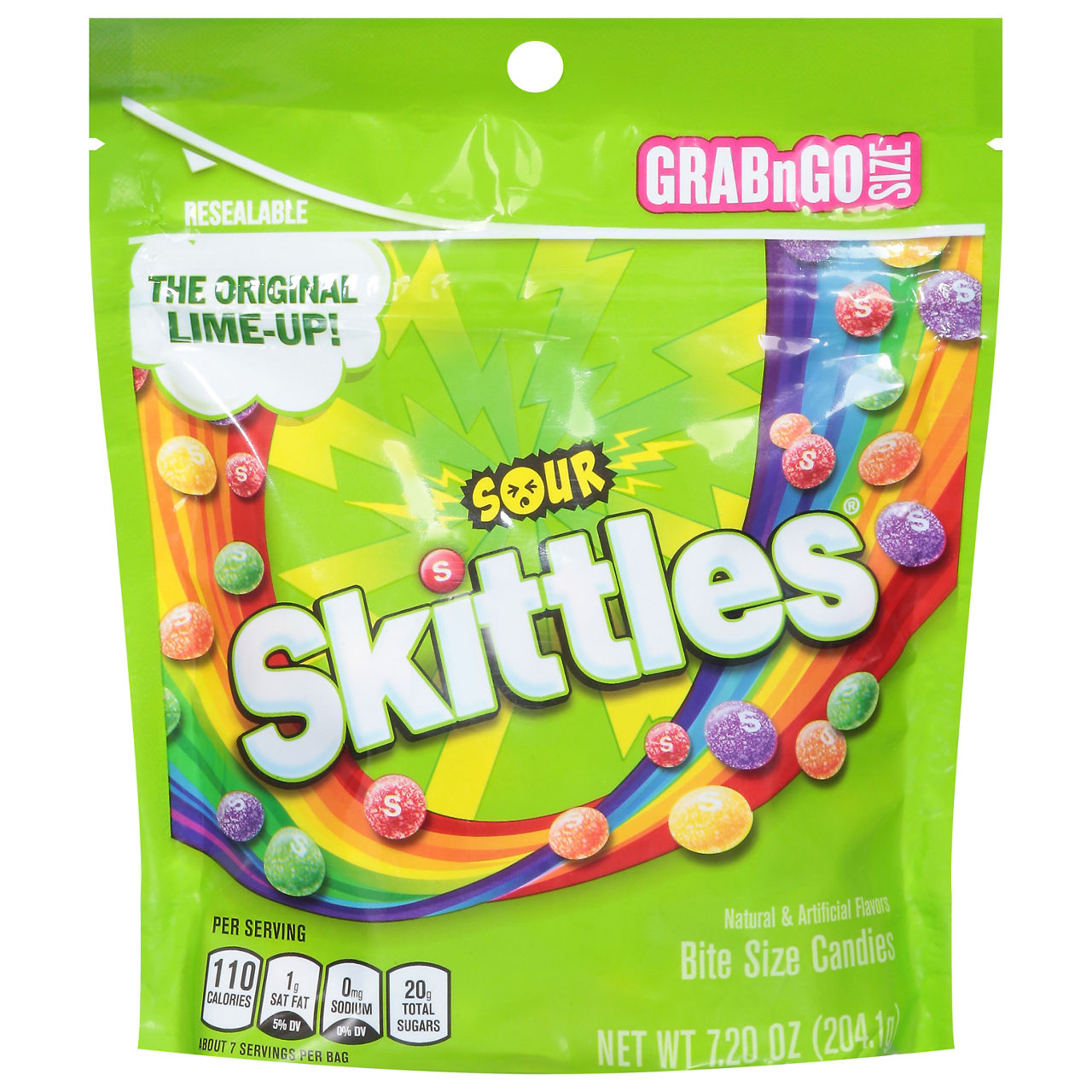 Sour Skittles Pouch. Re-sealable pouch customers love. Boldly branded Skittles bag in bright green. Who knew tasting the rainbow would be so sour and so sweet? Skittles® candies in sour flavors are a treat customers have been longing for. Peg bags allow for easy merchandising on shelves and also on vertical peg racks. The large 7.2 ounce pouch is re-sealable so customers will enjoy the larger portion that they can share and save for later. Boldly branded with the Skittles rainbow, this item will be a standout in your candy assortment.