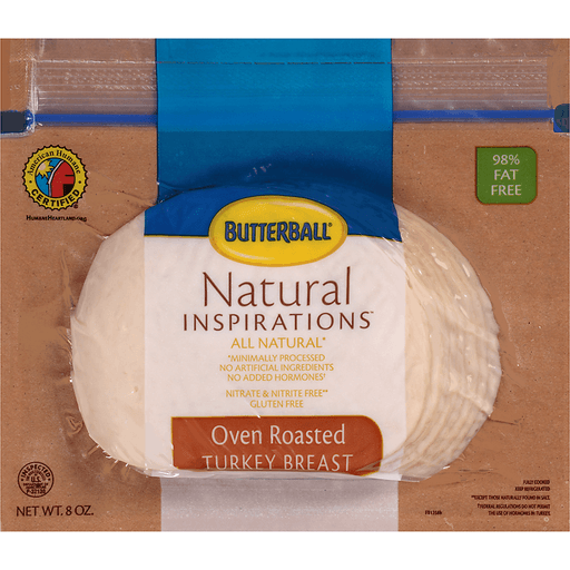Butterball® Natural Inspirations™ Oven Roasted Turkey Breast. American Humane Certified®. HumaneHeartland.org. All natural*. *Minimally processed. No artificial ingredients. No added hormones†. Nitrate & nitrite free**. Gluten free. Inspected for wholesomeness by U.S. Department of Agriculture. 98% fat free. **Except those naturally found in salt. †Federal regulations do not permit the use of hormones in turkey.