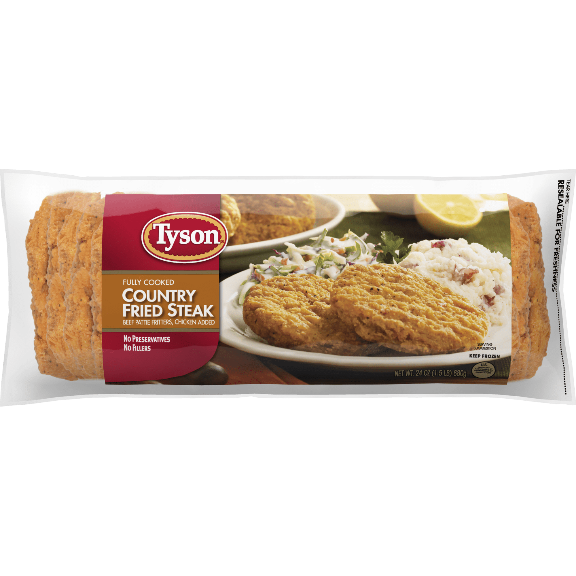Made with no preservatives or fillers, Tyson® Fully Cooked Country Fried Steak Patties are a delicious addition to any meal. Our patties are blended with beef and chicken for extra flavor, then they are breaded and seasoned to perfection. With 9 grams of protein per serving, these Country Fried Steak Patties are fully cooked and ready to eat. Simply prepare in an oven or microwave and serve with country-style white gravy for a satisfying dinner. Includes one 24 oz. package of Fully Cooked Country Fried Steak Patties. Everything seems to turn out a whole lot better when you keep it simple and stick to the good stuff. The 100% real stuff that makes life great. At Tyson Foods, that means quality beef from Americaâs farms. Keep it real. Keep it Tyson.