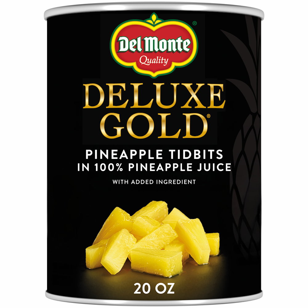 DEL MONTE DELUXE GOLD Canned Pineapple Tidbits in 100% Juice make it easy to enjoy high quality fruit in minutes. These pineapple tidbits are packed with delicious ripe pineapple in real fruit juice for a ready to eat fruit snack you can feel good about. DEL MONTE canned pineapple is an excellent source of Vitamin C and contain no artificial preservatives making them a convenient wholesome and ready to eat fruit option for busy nights. Made with 100% pineapple juice and pineapple tidbits this Non-GMO* canned fruit is ideal as part of a quick lunch snack or as a flavorful and visually appealing addition to a savory baked ham or on a pineapple upside down cake. For more delicious options try these canned pineapple tidbits on a Hawaiian pizza or fruit cocktail dessert. Each Non-BPA** can stores well in a pantry or cabinet for a convenient fruit snack whenever you need delicious fruit on-the-go. Bring the wholesome goodness of the Earth to your family with DEL MONTE DELUXE GOLD Pineapple Tidbits. *.