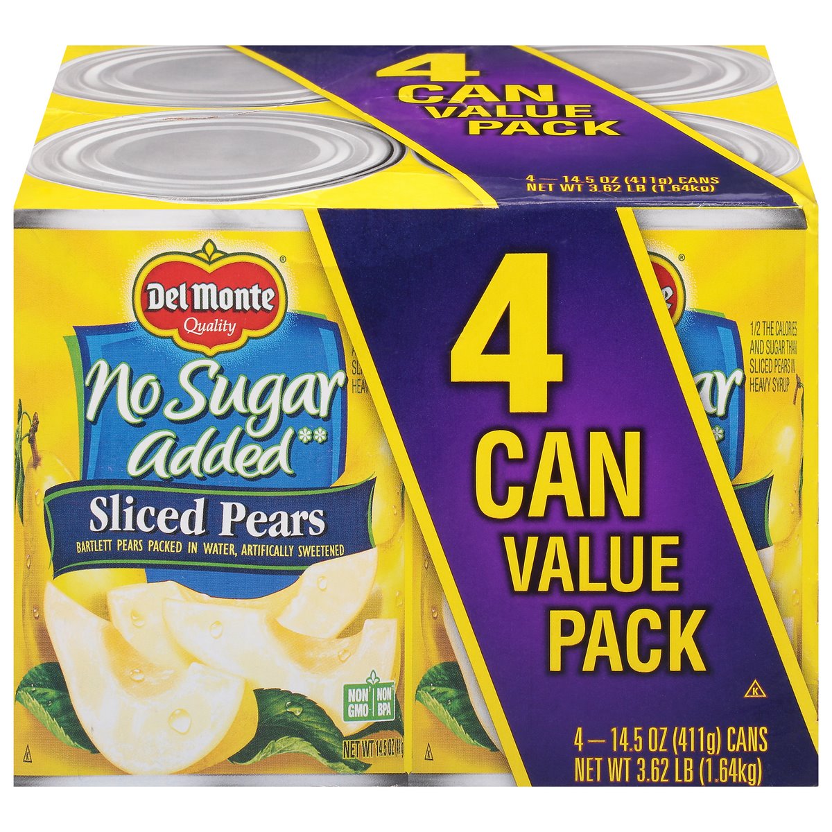 DEL MONTE No Sugar Added Sliced Bartlett Pears make it easy to enjoy quality fruit in minutes. These fruit can pears are packed with ripe pears in sweet water.* DEL MONTE pears contain no artificial preservatives. Picked and packed at the peak of ripeness and immersed in artificially sweetened water, this Non-GMO** canned fruit is ideal as a snack or as a flavorful addition to fruit salad. *Artificially sweetened. **.
