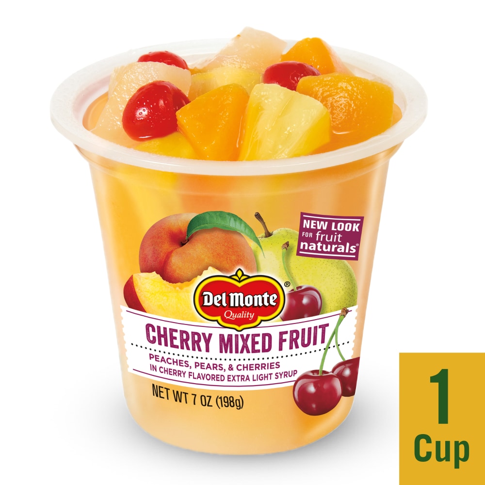 Peaches, pears, & cherries in cherry flavored extra light syrup. Excellent source of antioxidant vitamin C. New look for fruit naturals. Quality. www.delmonte.com. how2recycle.info.