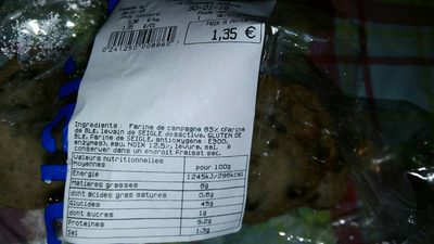 Ingrodlents: Farine De Campagne 83 De Blé, Levain De Seigle Gl Blé, Farine De Seigle, Antioxggène Enzymes), Eau, Noix 12.57., Levure, Sel Conserver Dans Un Endroit Fraiset Set