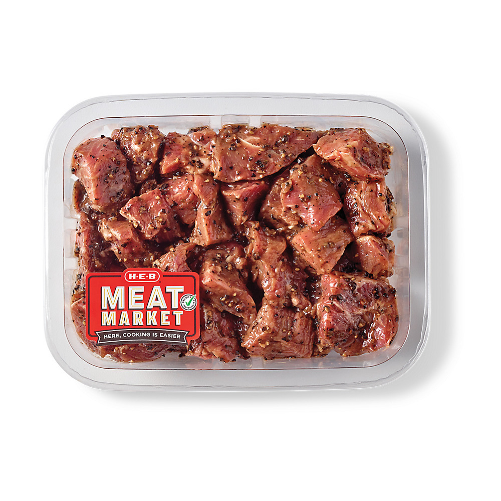 Smothered in a savory garlic peppercorn marinade, these boneless steak tips from our H-E-B Meat Market are ready to enjoy in about 10 minutes. Whether you toss them in a skillet for quick sautéing action or into the air fryer basket, these meaty chunks turn out juicy and packed with rich, beefy flavor. Serve with mashed potatoes, rice or some buttered noodles for a comforting home-cooked dinner. • Boneless beef steak tips. • Marinated in a garlic peppercorn sauce. • Meaty and chunky. • Cook on stovetop or in air fryer. • Ready in about 10 minutes. • Prepped for your convenience. • From our H-E-B Meat Market. About H-E-B Meat Market. Increase your cooking confidence with a little help from our H-E-B Meat Market. Freshly prepped and either marinated, seasoned or pre-assembled, these meats come with detailed instructions that guide you in the moment and also going forward, giving you exposure to new techniques and flavor combos. And by saving you a couple prep steps, you’re free to focus on sides and dessert. Explore our wide selection of convenient options in the meat department.