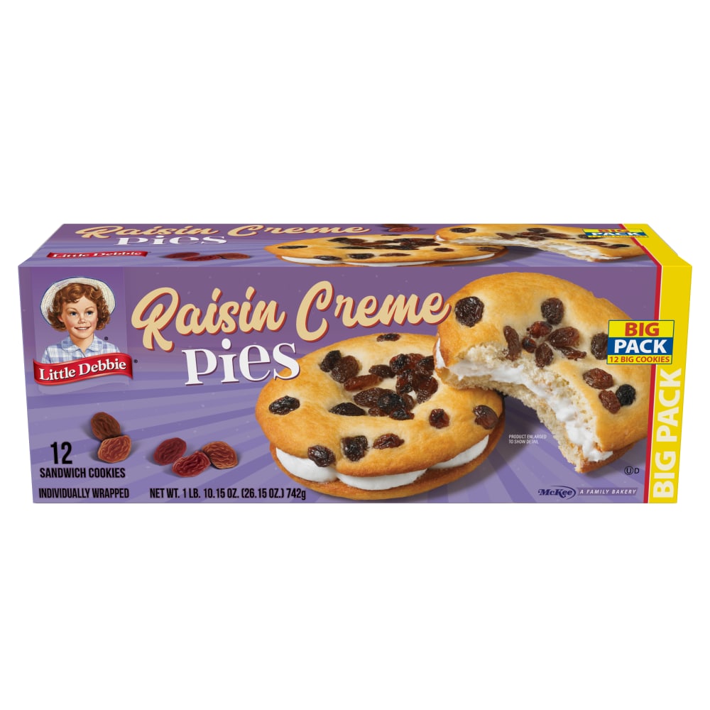 Did you know Little Debbie Raisin Creme Pies were one of our original snacks? A layer of our classic creme is found between two soft vanilla-flavored sandwich cookies. Then we sprinkle the top with scrumptious raisins! If you take a bite of this snack, you won’t be able to resist the urge to eat one more! Try them today! 12 Sandwich cookies per cartonIndividually wrappedCertified Kosher by the Orthodox Union.