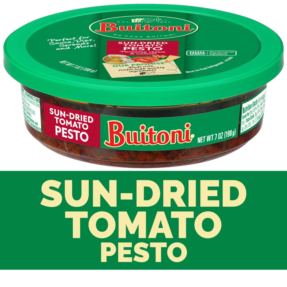 Serve up delicious meals in minutes with Buitoni Sun-Dried Tomato Pesto. This fresh take on pesto sauce blends sweet, yet tart taste of delicious sun dried tomatoes with rich Parmesan cheese, walnuts and a drizzle of extra virgin olive oil with other non-GMO ingredients for a pesto the whole family can savor. Toss sun dried tomato pesto sauce with Buitoni Three Cheese Tortellini and spinach for a quick dinner, or use as pizza sauce when making homemade pizzas. This vibrant pesto sauce also can be used as a marinade for chicken or fish and is perfect spread onto a grilled chicken wrap or panini. Pesto can also be used as a vinaigrette for a salad or blended with chickpeas to make a sun dried tomato hummus. No matter how you prepare Buitoni Pesto Sauces, they are ideal for adding delicious flavor to a wide variety of appetizers, entrees and sides. With this 7 oz container of Buitoni Sun-Dried Tomato Pesto, you can create crave-worthy, quick meals the entire family will enjoy. Buitoni provides convenient and delicious Italian-inspired meal solutions that give busy parents a fresh way to think about dinner. Try Buitoni Spicy Red Pepper Pesto, Spinach Artichoke Pesto, Classic or Reduced Fat Basil Pesto. In addition to pesto, Buitoni’s line of refrigerated pasta sauce includes Meat Sauce, Marinara Sauce and Alfredo Sauce. Buitoni also offers ravioli, tortellini and long cut pasta shapes such as fettuccine, linguine, spaghetti and angel hair. All Buitoni products are made with simple, high-quality ingredients you can feel good serving for family meals.