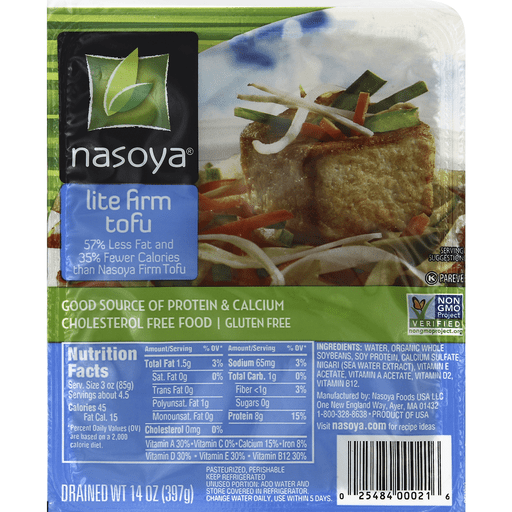 57% less fat and 35% fewer calories than Nasoya firm tofu. Good source of protein & calcium. Cholesterol free food. Gluten free. Non GMO Project verified. nongmoproject.org. Visit nasoya.com for recipe ideas.