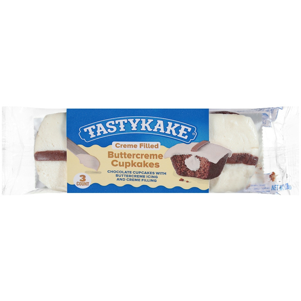 3 buttercream iced cupcakes. Baked fresh! Baked in a green building. Tastykake products are made to taste great.