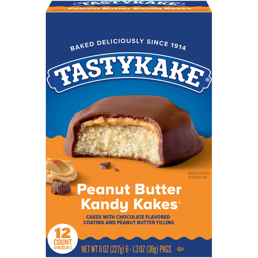 Tastykake® Peanut Butter Kandy Kakes® are the perfect combination of chocolate and peanut butter, sure to satisfy even the pickiest snacker. Featuring round cakes with a chocolate flavored coating and peanut butter filling, these snacks are the perfect two bite treat for chocolate and peanut butter lovers. Peanut Butter Kandy Kakes have been satisfying sweet tooths since the 1930s with their simple deliciousness and classic flavor combination of chocolate and peanut butter. With two Kandy Kakes per wrapped pack and six packs per box, Peanut Butter Kandy Kakes are great to share or have double the deliciousness for yourself. Pack them into a lunchbox or toss into a bag for the easiest and most delicious on-the-go treat. Whether you prefer them for a dessert, an afternoon pick-me-up or a late night treat, you'll want to keep these family-approved snack cakes stocked in your pantry at all times. Keep Tastykake on hand, because having any other snack is a miskake™. Tastykake has baked iconic treats for over 100 years, creating tasty cakes, muffins, donuts, pastries, pies and more. With so many delicious and unique treats to choose from and so many happy snack-lovers, why would you ever choose another brand? Whether it is a quick bite on-the-go or a reward after a long day, at Tastykake, we take snacking seriously, and our products are here to satisfy. Choose Tastykake and accept no substitutes™.