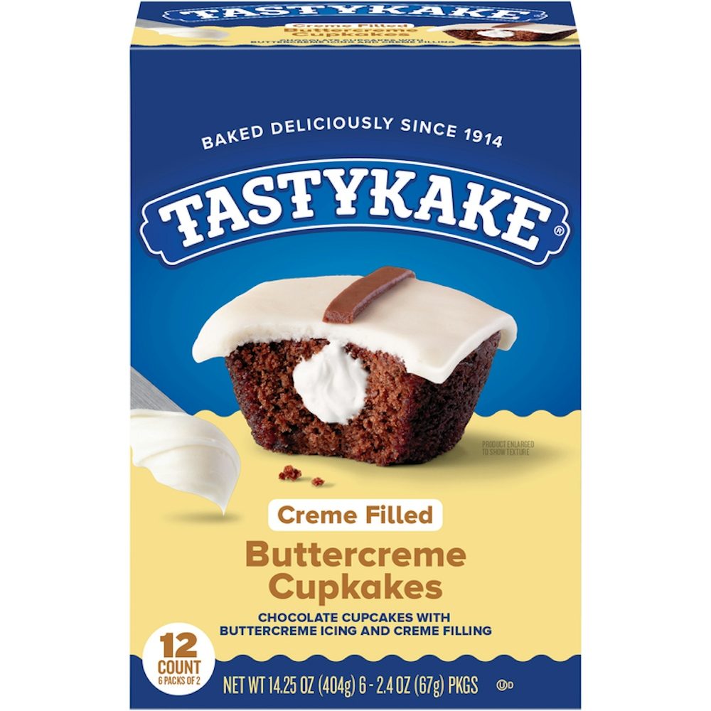 With delicious chocolate cake and decadent icing, Tastykake® Buttercreme Cupkakes are a chocolate lover's dream. Featuring creme filled chocolate cupcakes with decedent buttercreme icing, these delectable treats are sure to delight even the pickiest snacker. Pack them into a lunchbox or toss into a bag for the easiest and most delicious on-the-go chocolaty treat. Whether you prefer them for a dessert, an afternoon pick-me-up or a late night treat, you'll want to keep these family-approved snack cakes stocked in your pantry at all times. Keep Tastykake on hand, because having any other snack is a miskake™. Tastykake has baked iconic treats for over 100 years, creating tasty cakes, muffins, donuts, pastries, pies and more. With so many delicious and unique treats to choose from and so many happy snack-lovers, why would you ever choose another brand? Whether it is a quick bite on-the-go or a reward after a long day, at Tastykake, we take snacking seriously, and our products are here to satisfy. Choose Tastykake and accept no substitutes™.