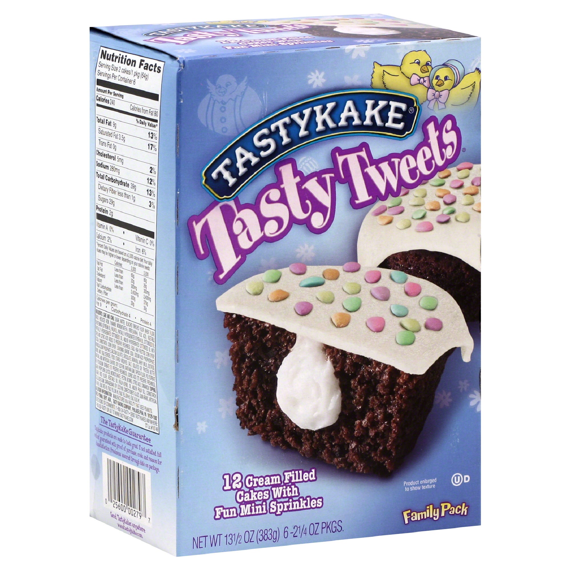 Iced creme filled chocolate cakes with sprinkles. 6 packs of 2. Baked deliciously since 1914. Great for Easter basket! From the flowers family of bakers. Nobody bakes a cake as tasty as a Tastykake! www.tastykake.com. Visit us on Facebook. Instagram.