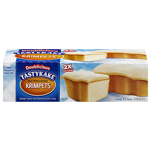Sponge cakes with butterscotch icing. 6 packs of 2. Baked deliciously since 1914. Doublicious. 2x the icing! Nobody bakes a cake as tasty as a Tastykake!