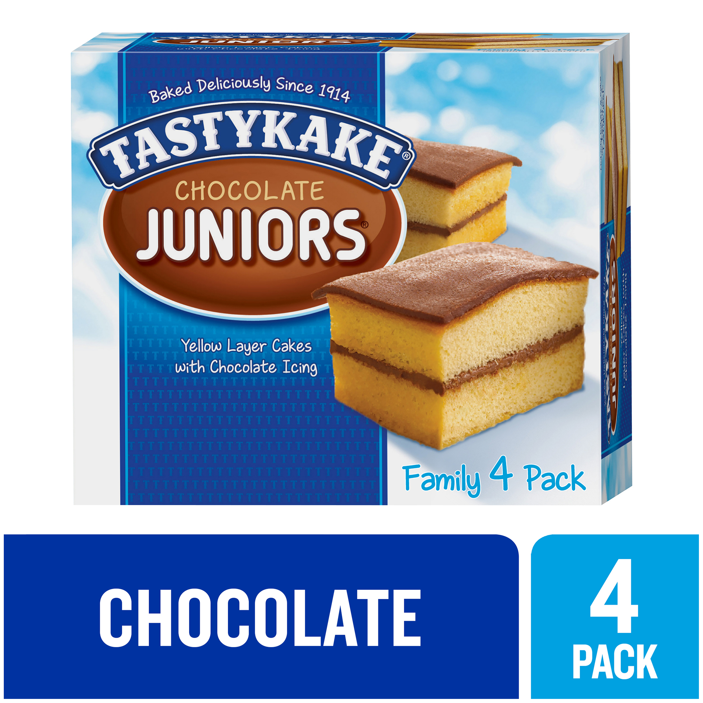 Tastykake® Chocolate Juniors® are like having a slice of birthday cake anytime, featuring two layers of rich, yellow cake and delectable chocolate icing. Juniors have been a fan favorite since the 1920s, and are the product that helped create the Tastykake tag line "the cake that made mother stop baking." Don't let the name deceive you, these 3 oz layer cakes are large enough to satisfy any sweet lover. Pack these individually wrapped snack cakes into a lunchbox or toss into a bag for the easiest and most delicious on-the-go sweet treat. Whether you prefer them for a dessert, an afternoon pick-me-up or a late night treat, you'll want to keep these family-approved snack cakes stocked in your pantry at all times. Keep Tastykake on hand, because having any other snack is a miskake™. Tastykake has baked iconic treats for over 100 years, creating tasty cakes, muffins, donuts, pastries, pies and more. With so many delicious and unique treats to choose from and so many happy snack-lovers, why would you ever choose another brand? Whether it is a quick bite on-the-go or a reward after a long day, at Tastykake, we take snacking seriously, and our products are here to satisfy. Choose Tastykake and accept no substitutes™.