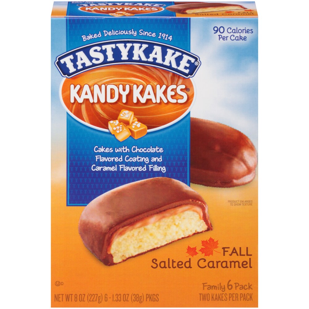 Cakes with chocolate flavored coating and caramel flavored filling. Baked deliciously since 1914. 90 calories per cake. Two kakes per pack. If you have any questions or comments about Tastykake products, please call us toll-free at 1-866-245-8921. www.Tastykake.com.