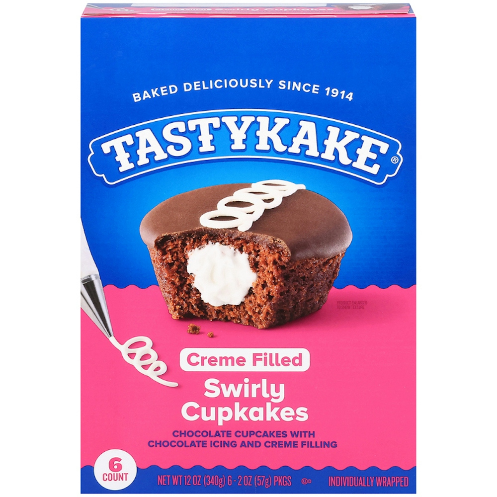 • 8-count pack of individually wrapped treats is perfect for the whole family. Individually wrapped Tastykake® Swirly Cupcakes are a delicious chocolate cake cupcake, filled with creme and topped with chocolate frosting. These cakes are great for a lunchtime dessert, afternoon treat or as an anytime indulgence.