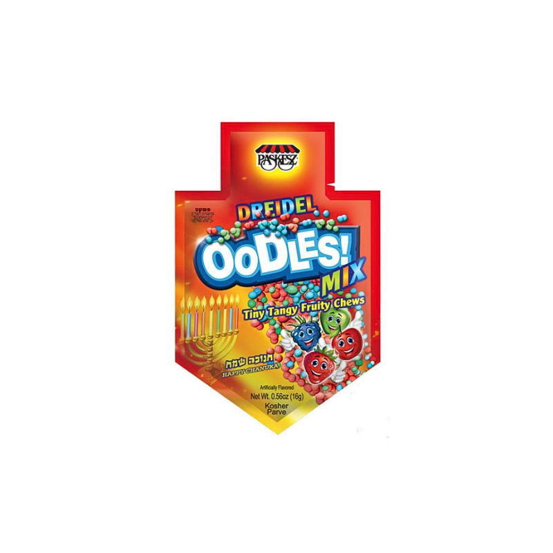 - The manufacturer of Tiny Tangy Fruity Chews Dreidel Oodles! Mix is Paskesz.