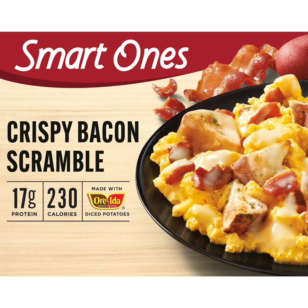 - The manufacturer of Scrambled Eggs with Crispy Chunks of Bacon and Creamy Cheese Sauce with a Side of Diced Potatoes is Smart Ones.