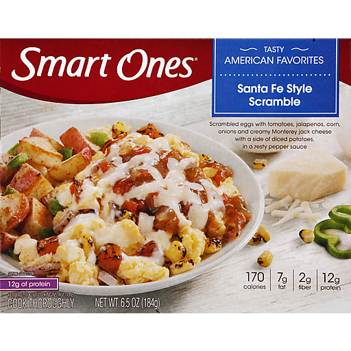 Smart Ones Santa Fe Style Scramble delivers delicious American style flavors to satisfy your cravings in an easy to make microwave meal that's ready in minutes. The frozen breakfast meal features scrambled eggs with tomatoes, jalapenos, corn, onions and a creamy Monterey Jack cheese with a side of diced potatoes in zesty pepper sauce. As an added bonus, the tasty and easy American inspired scrambled eggs with veggies have 12 grams of protein per serving. Microwave Southwest scrambled eggs on high for 2 minutes, stir and microwave for an additional 1 minute. Each 6.5 ounce Smart Ones Santa Fe Style Scramble frozen breakfast potatoes and eggs comes packaged in a microwaveable tray for easy meal preparation.