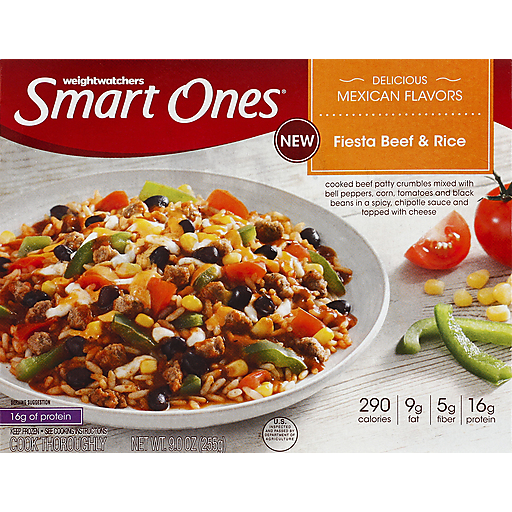 Smart Ones Fiesta Beef & Rice delivers delicious Mexican style flavors to satisfy your cravings in an easy to make microwave meal thats ready in minutes. This frozen dinner features Mexican rice and cooked beef crumbles mixed with bell peppers, corn, tomatoes and black beans in a spicy chipotle sauce and topped with cheese. As an added bonus, this tasty and easy Mexican style food has 16 grams of protein per serving. Pull back film over rice to vent, microwave on high for 3 minutes, stir and microwave for an additional 1 minute. Each Smart Ones Fiesta Beef & Rice frozen entree comes packaged in a 9 ounce microwaveable tray for easy meal preparation.