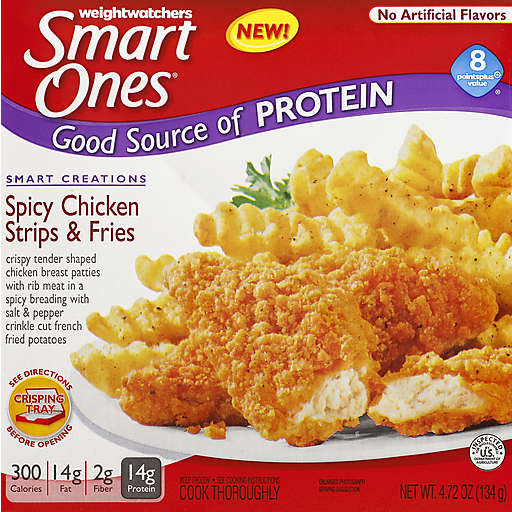 - The manufacturer of Spicy Chicken Strips & Fries Crispy Tender Shaped Chicken Breast Patties with Rib Meat in a Spicy is Smart Ones.
