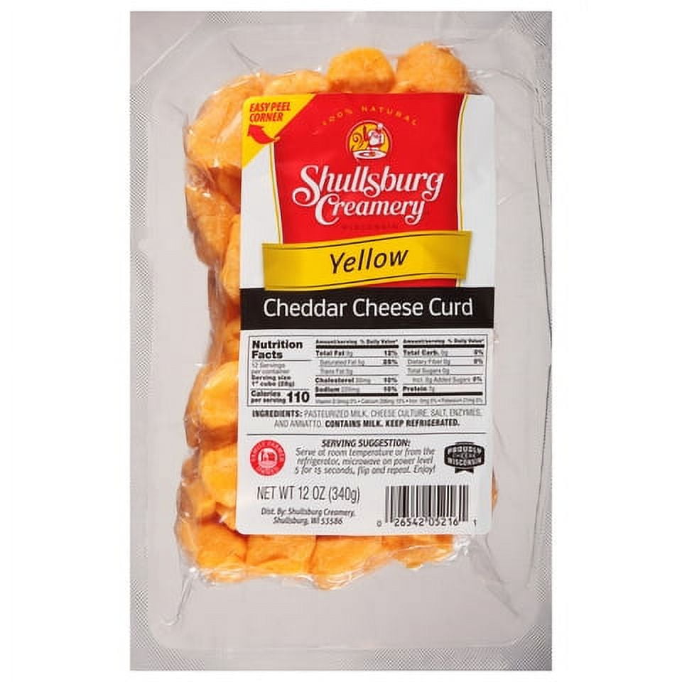 Shullsburg Creamery traditional cheese curds. The cheese that squeaks! Our cheese curds are made in the traditional way from natural Cheddar cheese. Shullsburg Creamery Cheddar cheese curds have long been sought after as an hors d'oeuvres. Shullsburg Creamery cheese curds are also perfect to serve at parties, on cheese trays, as a healthy snack option. Our convenient packaging has a peel back cover that when removed creates a "bowl" that works perfect for serving. Shullsburg Creamery curds can be served straight from the refrigerator, or for an even better taste and to get that squeak that cheese curds are known for, simply microwave for a few seconds. Shullsburg Creamery Cheddar Cheese Curds, 12 oz. package, keep refrigerated. Contains milk, egg free.