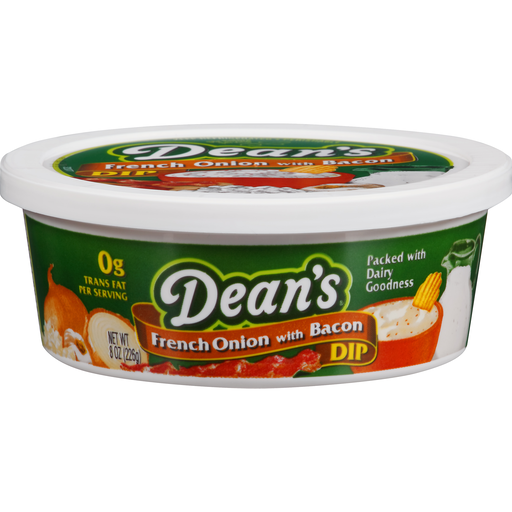 Dean's® French Onion with Bacon Dip. 0g trans fat per serving. Packed with dairy goodness. Dean's® is a registered mark of Dean Intellectual Property Services II, L.P. Question or comments, call 1-800-339-1957. Visit our website at www.deansdip.com.
