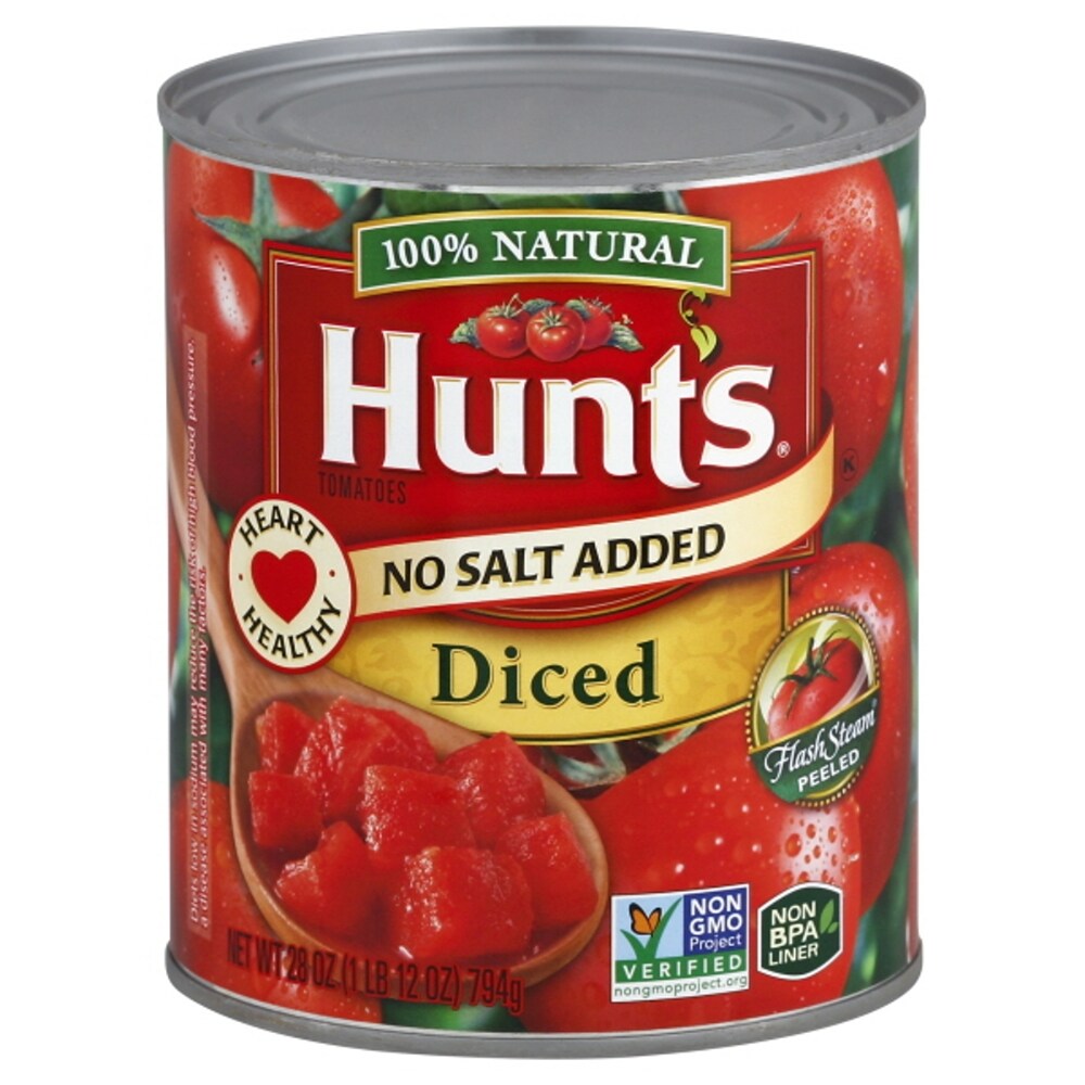 Canned, Jarred & Packaged Foods. Grocery & Gourmet Food. Pantry Staples. Tomatoes. Vegetables. Serve delectable dishes that the whole family will enjoy without the added sodium using Hunt's Diced Tomatoes, No Salt Added. Bring garden-fresh flavor and optimal sweetness to your pasta sauces, casseroles, stews, chicken dishes, and more. Hunt's vine-ripened tomatoes are peeled, diced, and ready to go. No compromise, Hunt's Diced Tomatoes No Salt Added are 100% natural, with no artificial preservatives. Hunt's Flashsteam tomatoes are peeled with simple hot water. Contains 28 oz of diced tomatoes; 30 calories and 15 mg sodium per serving. Hunt's tomatoes are picked at the peak of ripeness and canned within hours, because great tasting meals start with great ingredients.