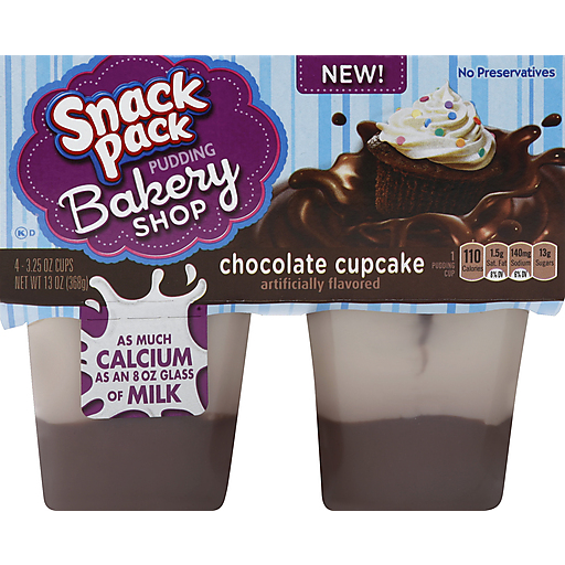 Snack pack® bakery shop chocolate cupcake pudding. No preservatives. Artificially flavored. 1 pudding cup. 110 calories. 1.5g sat fat, 8% dv. 130mg sodium, 5% dv. 12g sugars. As much calcium as an 8 oz glass of milk.