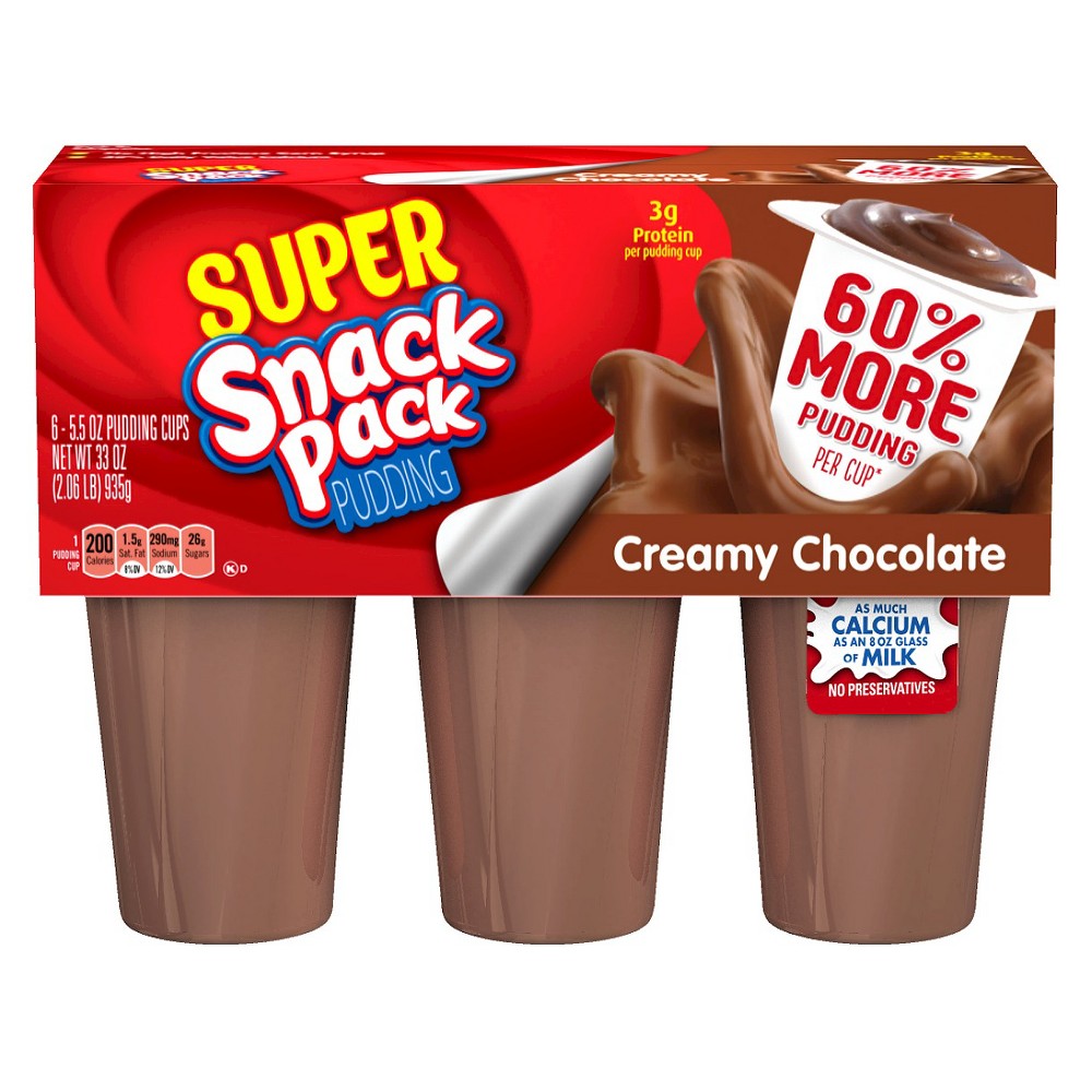 Enjoy a creamy, delicious treat any time of day with super Snack Pack Chocolate Pudding cups, with 60 more pudding than regular 3.25 oz Snack Pack. This chocolate Pudding dessert is the original treat that no one can resist. Gluten-free and kosher, chocolate Snack Pack Pudding cups are made with real milk and no high-fructose corn syrup. Perfect for your child's lunch box, these tasty pudding cups make a great treat for Mom and dad, too.