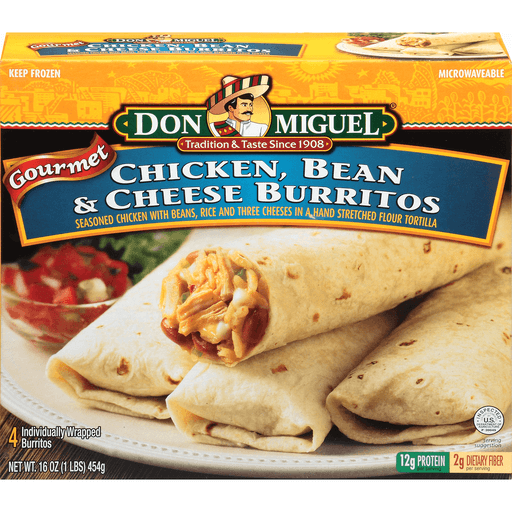 - The manufacturer of Chicken, Bean & Cheese Gourmet Burritos Seasoned Chicken with Beans, Rice and Three Cheeses in a is Don Miguel.