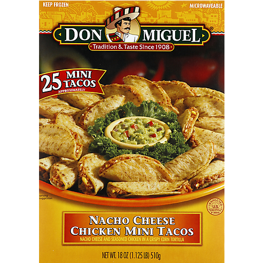 Tradition & taste since 1908. Nacho cheese and seasoned chicken in a crispy corn tortilla. Approximately 25 mini tacos. Microwaveable. Inspected for wholesomeness by US Department of Agriculture.