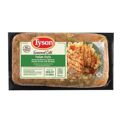 - The manufacturer of Italian Style Seasoned Cuts Boneless Skinless Chicken Breast with Rib Meat, Italian Style is Tyson.