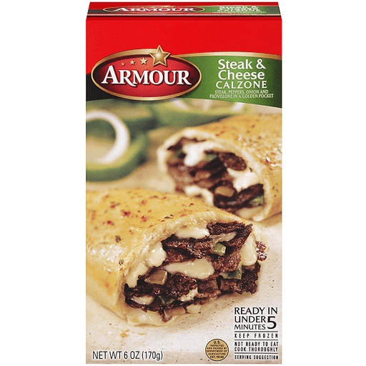 - The manufacturer of Steak & Cheese Steak, Peppers, Onion and Provolone in a Golden Pocket Calzone, Steak & Cheese is Armour.
