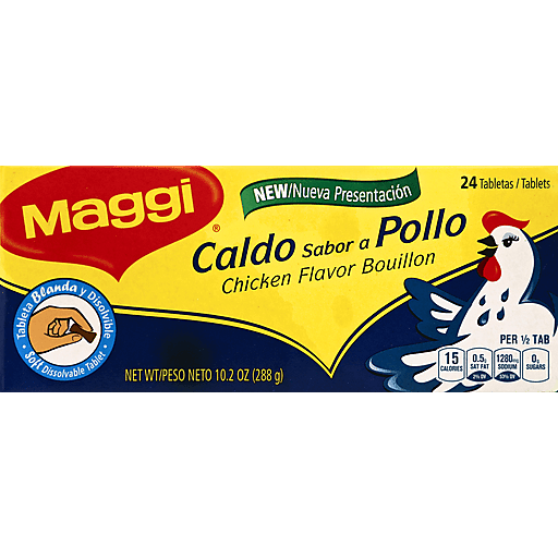 Maggi Chicken Bouillon Tablets are a staple in Latin America and add a burst of chicken flavor to your everyday homemade dishes. The chicken bouillon tablets are soft and dissolvable. The chicken broth bouillon is perfect for preparing delicious soups, rice, beans, stews, pastas and vegetables or for marinating poultry. Simply dissolve 1 of the chicken bouillon cubes into 2 cups of boiling water until dissolved to make 2 cups of chicken broth as a starter for your favorite recipes. Maggi chicken bouillon tablets contain 15 calories per serving, see nutrition information for sodium content.