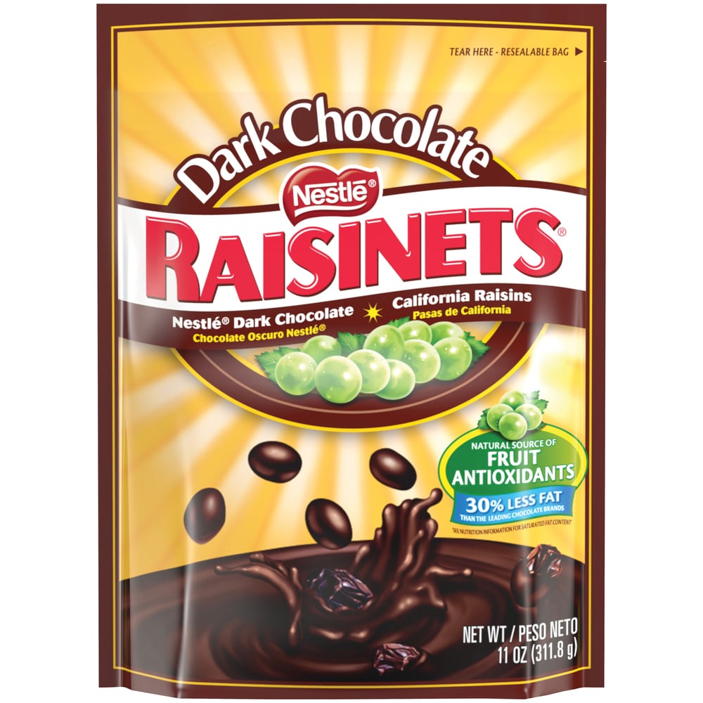 NESTLE RAISINETS are sun-ripened, plump juicy California raisins tucked in rich creamy NESTLE CLASSIC Milk Chocolate. RAISINETS have 30% less fat than the leading chocolate brands and are made with real fruit. Now this is an indulgence you can feel better about!