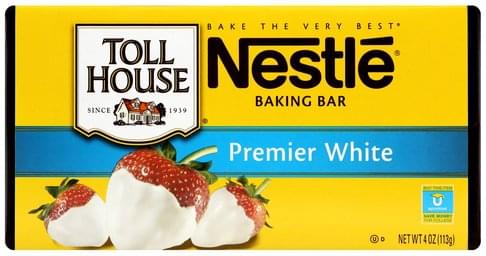 Nestle Toll House Baking Bar, Premier WhiteSUGAR. PALM KERNEL OIL, MILK, NONFAT MILK, HYDROGENATED PALM OIL, SOY LECITHIN, ARTIFICIAL FLAVOR.