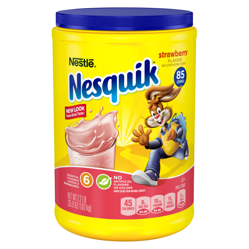 NESQUIK Strawberry Powder turns milk into an irresistibly delicious and nutritious drink for your family to enjoy and for you to feel good about, with 45% less sugar than the leading syrup brand. NESQUIK Strawberry Powder provides calcium, 8 grams of protein, and 7 essential vitamins and minerals when combined with low-fat milk to help them start the day. A good source of 7 essential vitamins and minerals. No Artificial Colors, Flavors, or Sweeteners. No High Fructose Corn Syrup. Kosher. NESQUIK Powder is also available in delicious chocolate flavor.