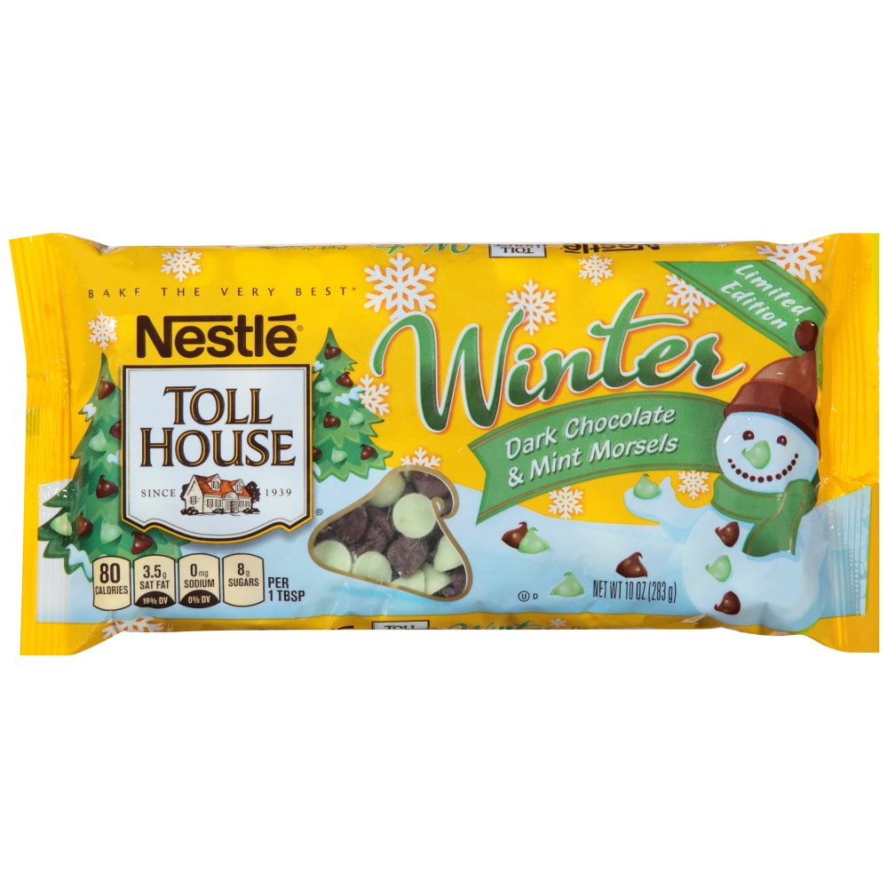 Nestle® Toll House® Winter Dark Chocolate & Mint Morsels. Since 1939. Limited edition. No preservatives. Per 1 tbsp: 80 Calories. 3.5g Sat fat, 18% DV. 0mg Sodium, 0% DV. 8g Sugars. Net Wt 10 oz (283 g).