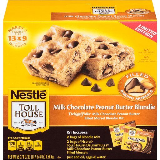 NESTLE TOLL HOUSE DELIGHTFULLS Milk Chocolate Peanut Butter Filled Morsel Blondie combines that sweet blondie taste with creamy peanut butter filled morsels for the ultimate treat the whole family will love! Perfect for after-school or an anytime snack. It's easy to make a variety of delightful peanut butter lovers treats. NESTLE TOLL HOUSE DELIGHTFULLS Milk Chocolate Peanut Butter Filled Morsel Blondie, has no preservatives, artificial colors, or artificial flavors. Kit includes 2 bags of Blondie Mix and 2 bags of NESTLE TOLL HOUSE DELIGHTFULLS Milk Chocolate Peanut Butter Filled Morsels.