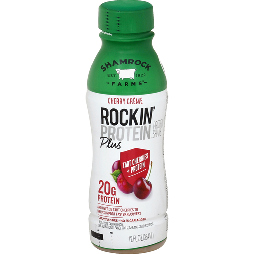 Tart cherries + protein. Add over 35 tart cherries to help supports faster recover. Lactose free. No sugar added. Not a low calorie food. See nutritional panel for sugar and calorie content. East. 1922. New. Ultra pasteurized. Gluten free. Excellent source of protein and calcium. To support faster recover as part of a fitness regimen. Contains 22% juice. We pledge not to treat our cows with the growth hormone rBST (No significant difference has been shown between milk derived from rBST-treated and non-rBST treated cows). Made with pure, great tasting milk loaded with protein. High protein to help build muscle. Delicious taste. Never chalky & always creamy. Everything we make at Shamrock Farms starts with pure, great tasting milk from our family of local farms. And we never add the artificial growth hormone rBST (No significant difference has been shown between milk derived from rBST-treated and non-rBST treated cows), ever. Our hands-on approach delivers a delicious difference you can taste. So pure. So fresh. So Shamrock. Questions or comments? Call 1-888-447-6943 or visit shamrockfarms.net. rockinprotein.com. Facebook. Twitter. Instagram. (at)rockinprotein. BPA free. Please recycle.