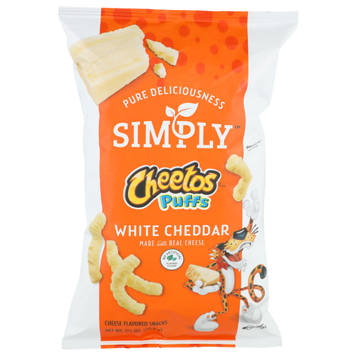 Simply put, Simply snacks have great taste, with no artificial flavors or preservatives. Delicious Simply CHEETOS Puffs White Cheddar Snacks are a treat to enjoy with the whole family! Dangerously delicious flavor made with real cheese Perfect size to take for a delicious on-the-go snack Includes 1 bag of Simply Cheetos White Cheddar flavored Cheese Snacks.